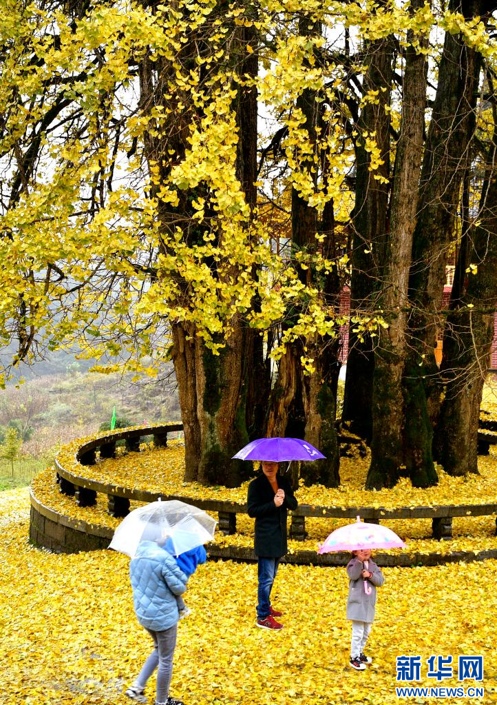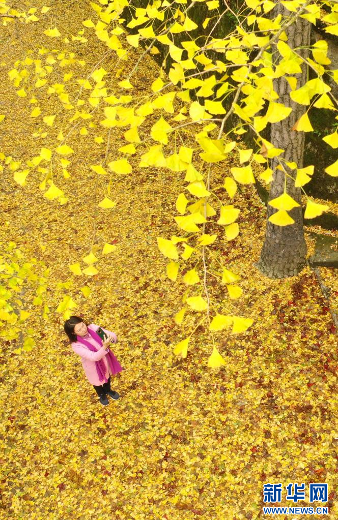 初冬时节,银杏树叶变黄,落叶犹如给地面铺上了一层“黄金毯”,吸引游人观赏。 新华社发(曹正平摄)