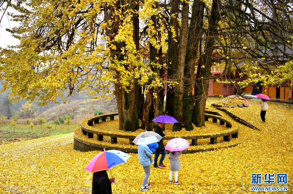 11月8日,在贵州省黔东南苗族侗族自治州黄平县飞云崖景区,游客拍摄银杏树。