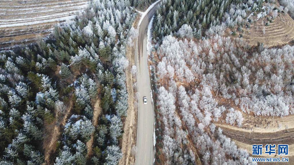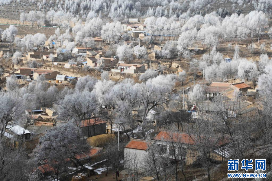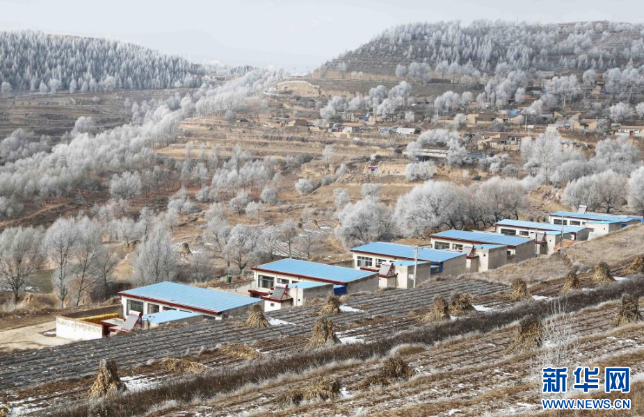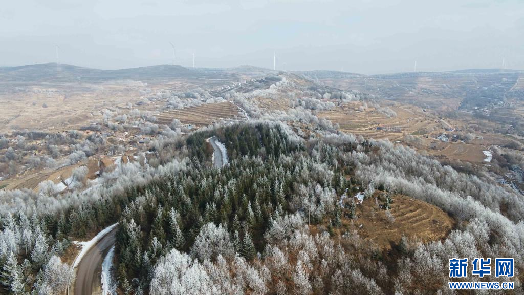 当日,甘肃省定西市出现雾凇景观,黄土高原上的梯田、树木和村庄银装素裹,美如画卷。