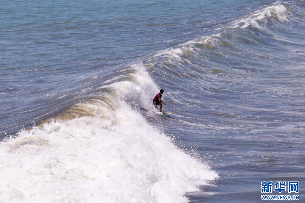 12月18日,在印度尼西亚巴厘岛,一名冲浪爱好者在海神庙附近冲浪。