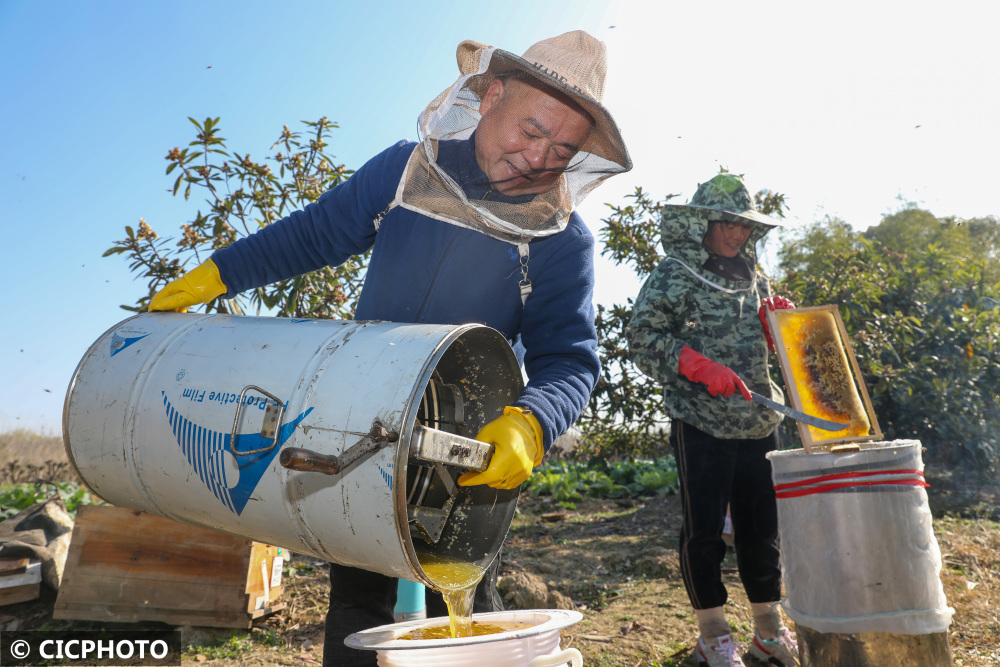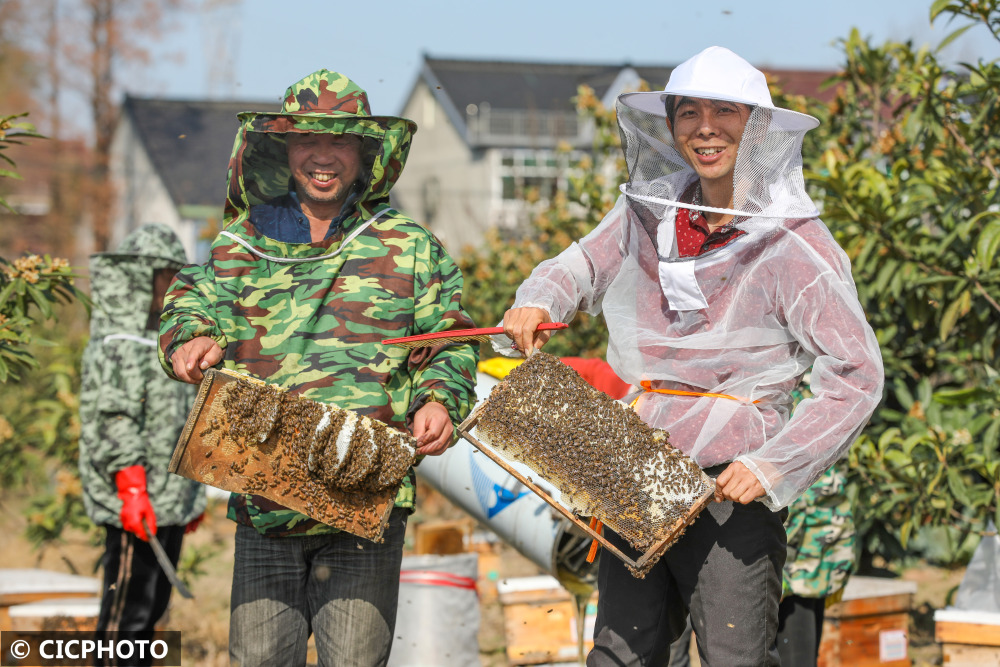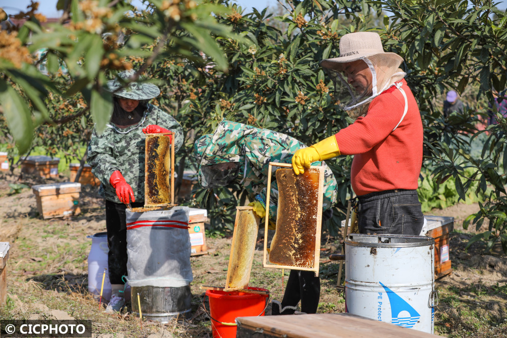以上图片:2021年12月20日,在浙江省湖州市德清县乾元镇联星村,蜂农们趁着晴好天气采收枇杷蜜。CICPHOTO/赵宁 摄