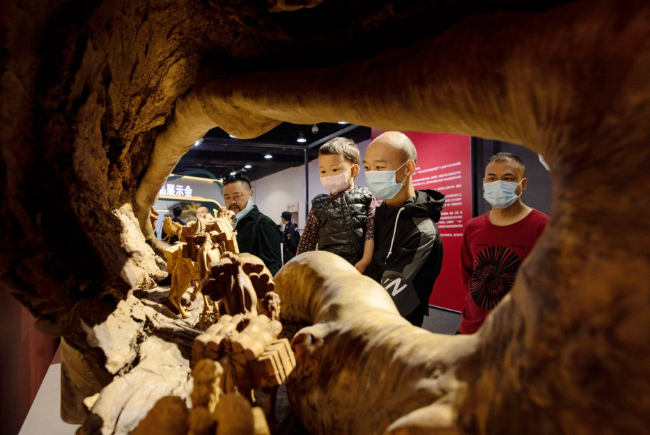 图为观众正在欣赏工艺美术大师的木雕作品