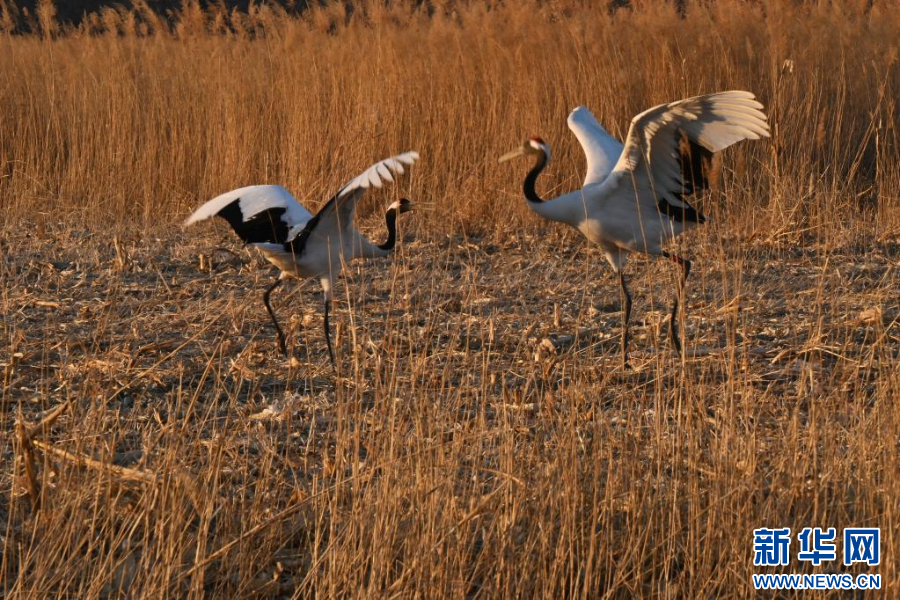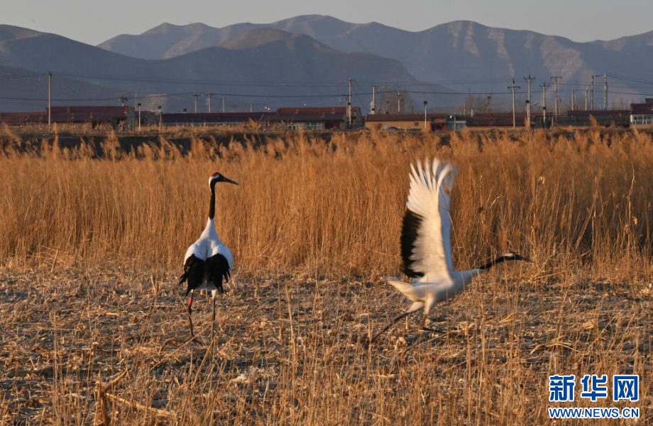 2月23日,两只国家一级保护动物丹顶鹤在山西省大同市广灵县壶流河湿地驻足栖息。
