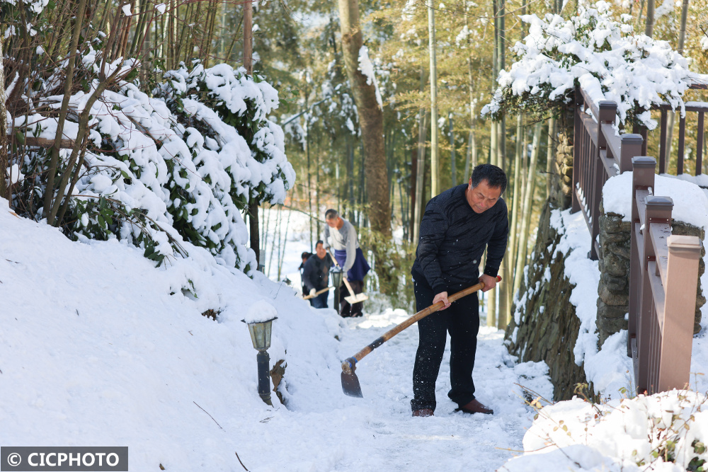 ↑2022年2月21日,在浙江省湖州市德清县莫干山,景区的工作人员在清理台阶上的冰雪。CICPHOTO/蔡俊 摄