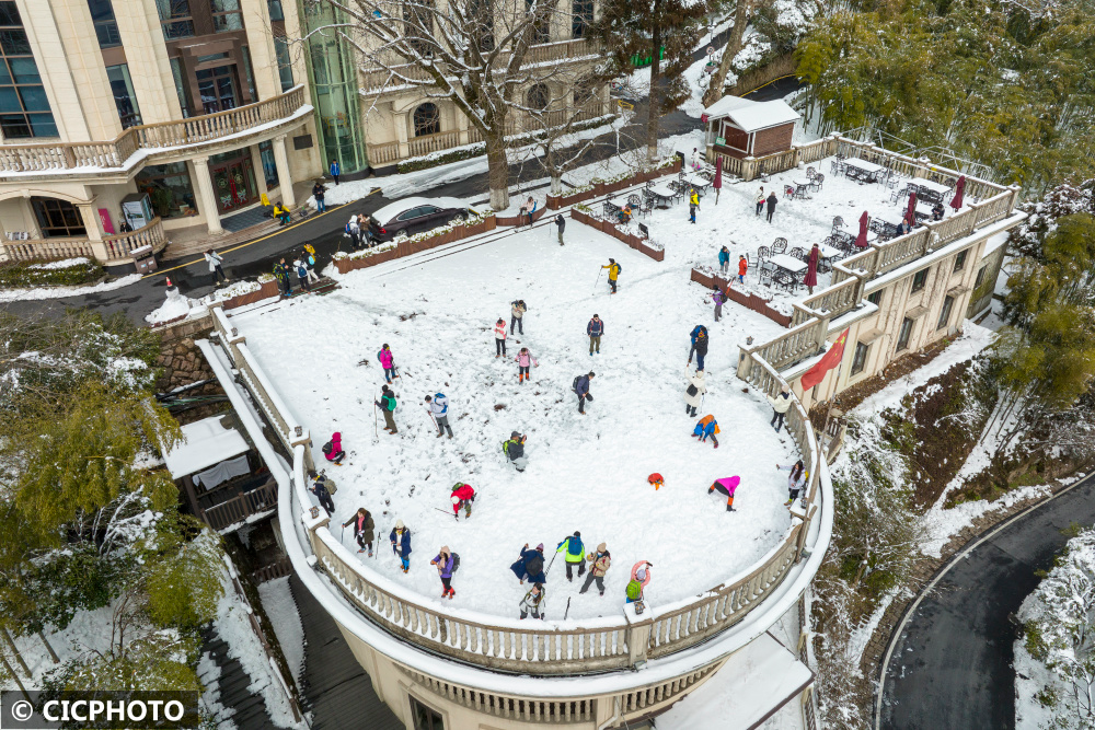 ↑2022年2月21日,在浙江省湖州市德清县莫干山,游客在打雪仗,享受冰雪乐趣。CICPHOTO/蔡俊 摄
