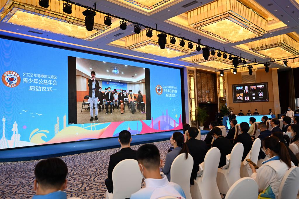 4月23日,澳门粤华中学学生周家耀在2022年粤港澳大湾区青少年公益年会启动仪式上视频发言。新华社记者金良快 摄