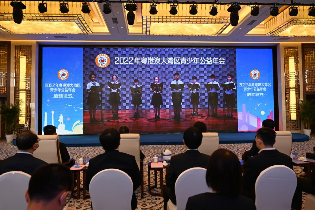 4月23日,学生在2022年粤港澳大湾区青少年公益年会启动仪式上视频连线表演诗歌朗诵《香江赞》。新华社记者金良快 摄