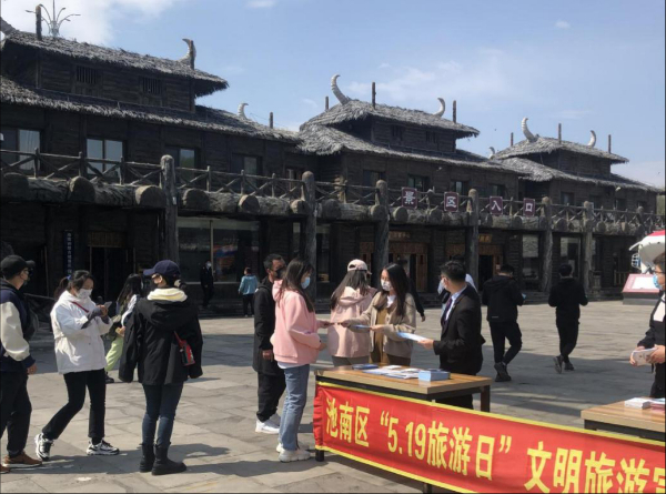 5月19日,长白山讷殷古城景区游人如织。池南区文旅局在做好疫情防控工作的前提下,采取线上、线下相结合的方式,在景区内开展了文明旅游系列宣传活动。