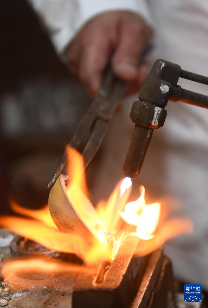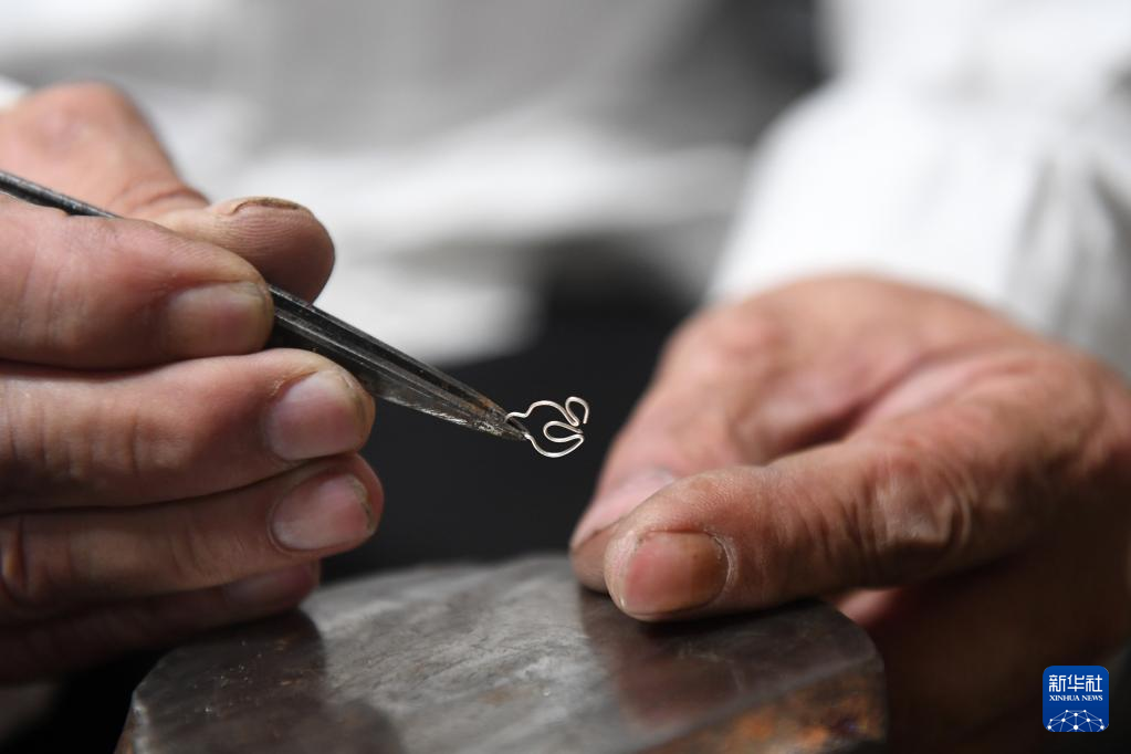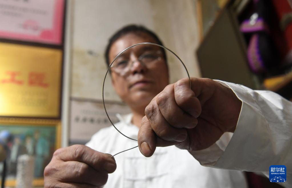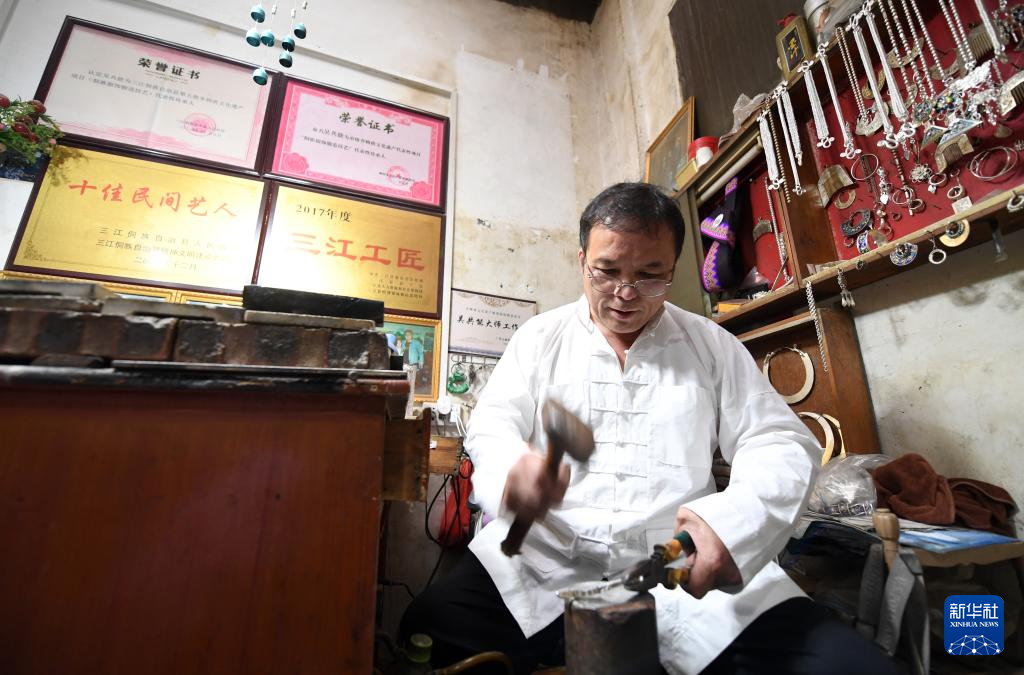 现年59岁的吴共能是广西三江侗族银饰锻造技艺非遗项目代表性传承人。他从父亲的手上传承了这门技艺,已经干了40多个年头。如今他的儿子也跟着学习银饰制作。吴共能说,大家的共同愿望就是侗族银饰锻造技艺在三江代代相传。