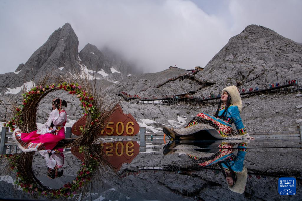 6月26日,游客在玉龙雪山景区拍照留念。