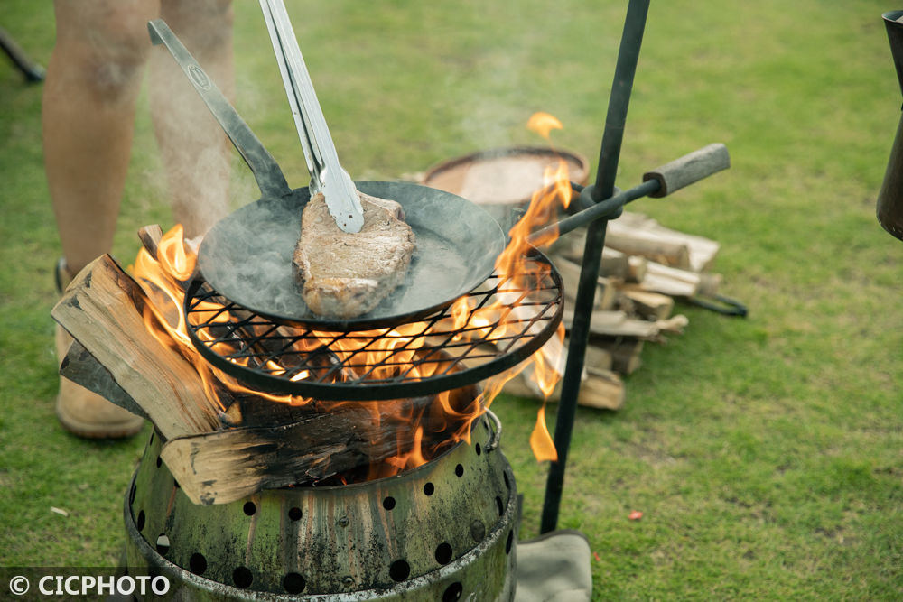 ↑2022年7月15日,在浙江省湖州市德清县的莫干山露营地,旅者野炊时煎出的牛排。CICPHOTO/高明 摄
