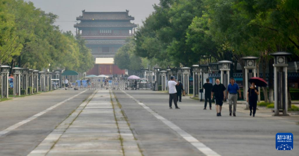 8月13日,市民在南中轴线御道景观区的永定门城楼前休闲。