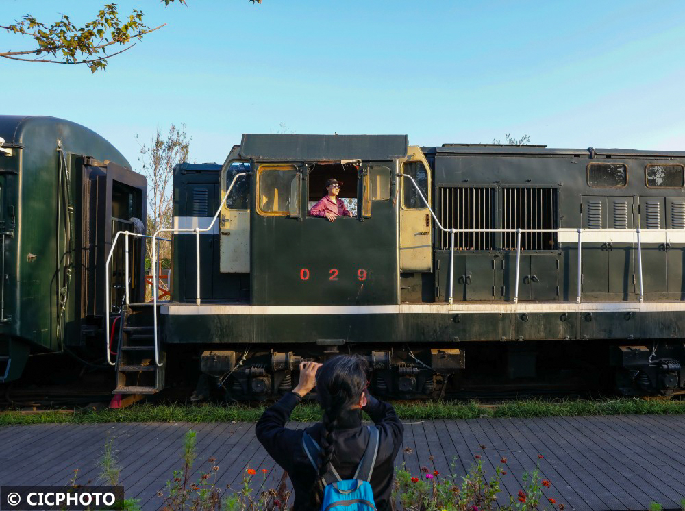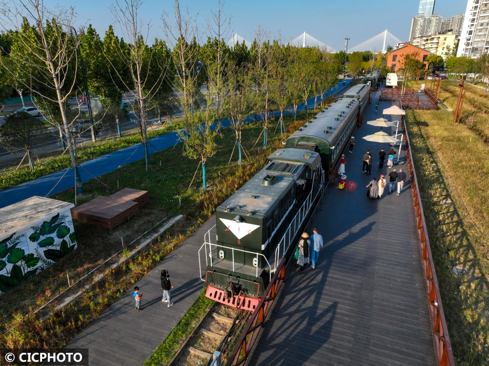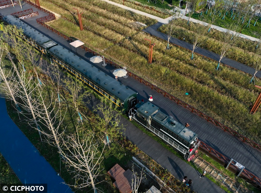 ↑2022年10月31日,游客在湖北省武汉市武昌区绿皮火车公园内拍照。(无人机照片)CICPHOTO/赵军 摄