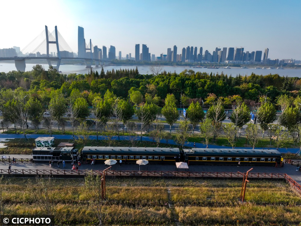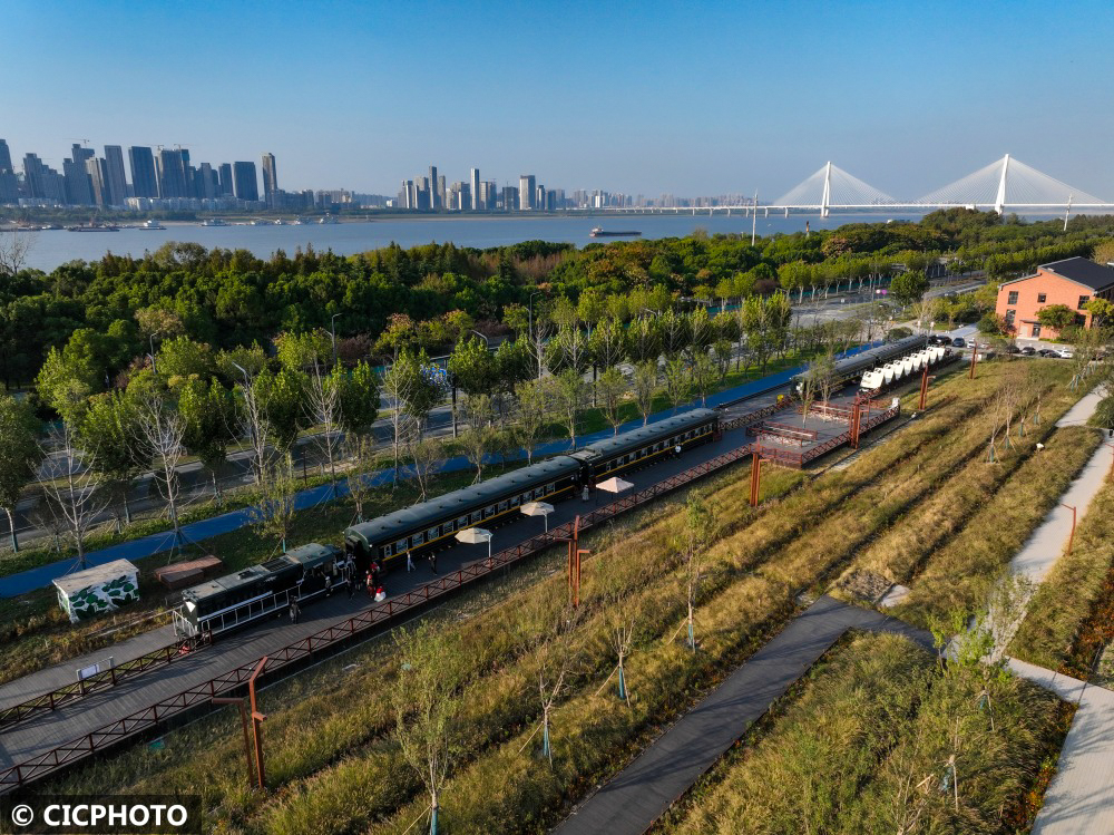 ↑2022年10月31日在湖北省武汉市武昌区拍摄的绿皮火车公园。(无人机照片)CICPHOTO/赵军 摄