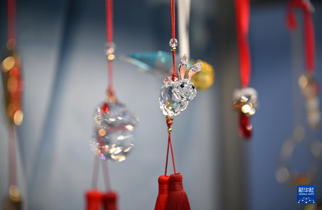在海口国际免税城拍摄的一款兔年主题挂饰(1月8日摄)。