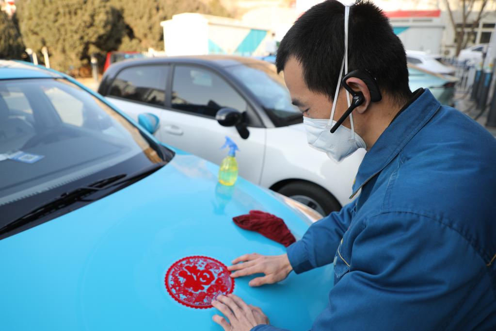 春节将至,樊伟给他的出租车贴上迎春剪纸。新华社记者 张睿 摄