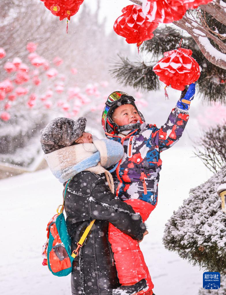1月24日,在位于河北省遵化市的唐山尚禾源旅游景区,舞狮演员与一名小游客互动。