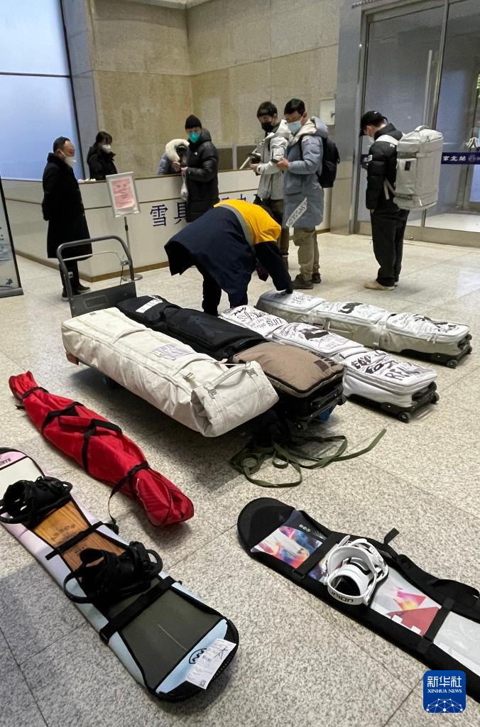 1月24日,滑雪爱好者在北京北站托运滑雪用具,准备乘坐“滑雪专列”去崇礼滑雪场滑雪休闲。