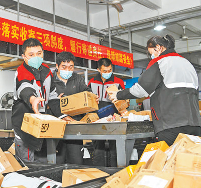 春节假期,顺丰深圳南山科技园站点工作人员正在分拣快递。新华社记者 梁旭摄