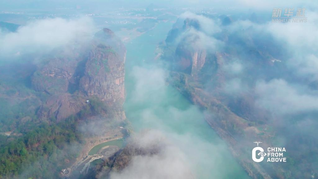 近日,久雨初晴的江西龙虎山出现云海奇观。从高空俯瞰,洁白的云雾在山峰间如潮水般涌动,神奇壮观,美如画卷。在阳光照耀下,山峰、河流在云雾中若隐若现,宛如仙境。