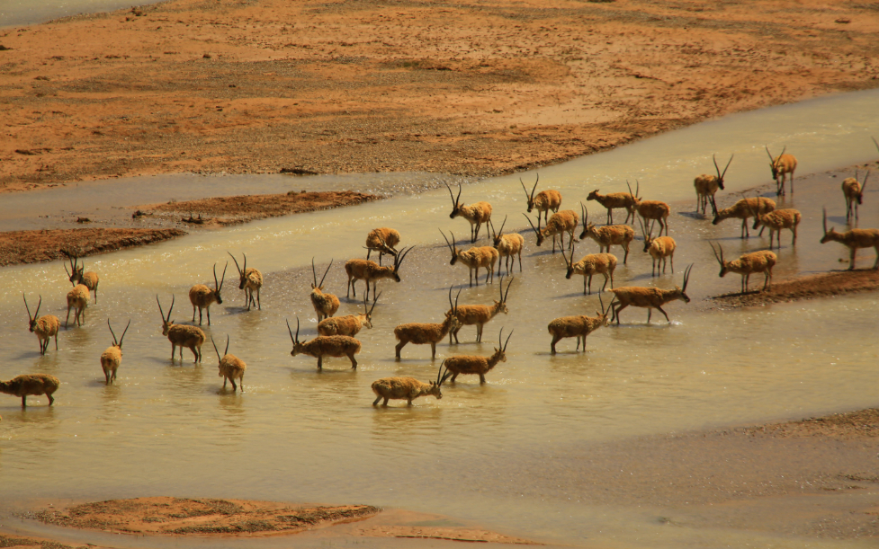 部分雄性藏羚在羌塘国家公园候选区江俄藏布泡澡 (羌塘国家级自然保护区管理局供图)