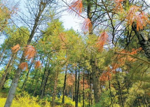 感染松材线虫病的松树呈现出红绿相间的色彩。(图片来源:国家林草局)