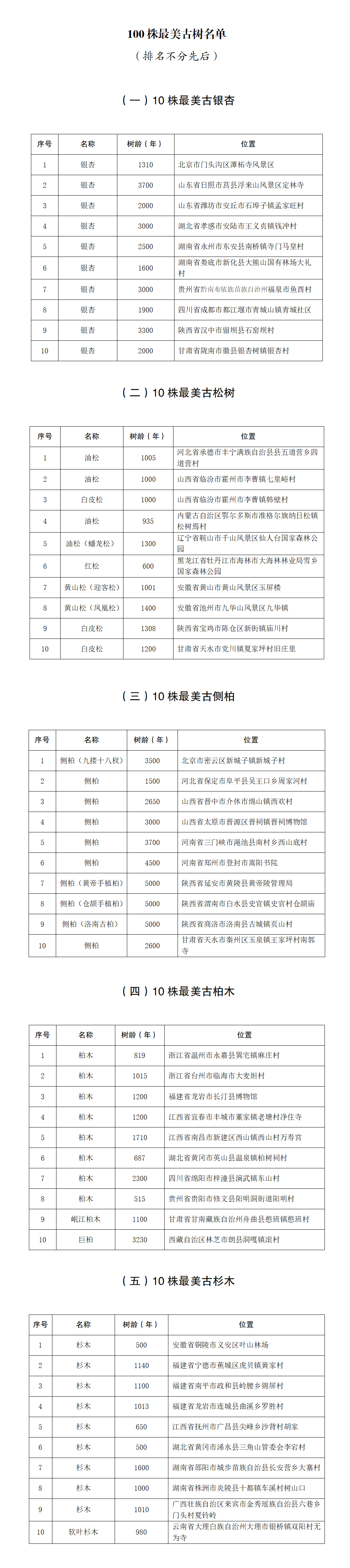 经过公众投票、专家评审、全网公示等环节,从全国各地推选出黄帝手植柏、黄山迎客松、北京潭柘寺帝王树等100株最美古树和蜀道翠云廊古柏群、林芝巨柏古树群、利川古水杉群等100个最美古树群。