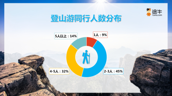 相比其他旅游项目,登山游对用户的体力和意志力都是较大的挑战,因此,大多数登山游用户会选择多人结伴同行,以便于登山途中互相鼓励、互相协助。《报告》显示,2-3人或4-5人同行是更多登山游用户的选择,出游人次占比分别为45%和32%。