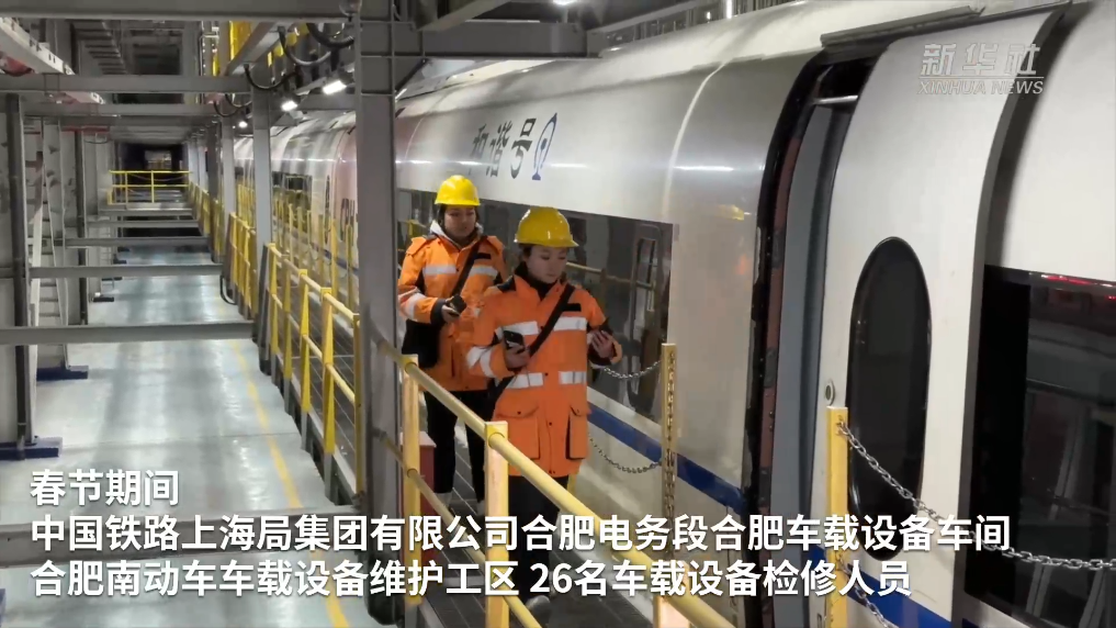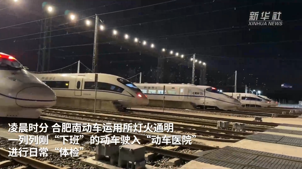 凌晨时分,合肥南动车运用所灯火通明。一列列刚“下班”的动车驶入“动车医院”,进行日常“体检”。 春节期间,铁路部门运维工作人员坚守岗位,对动车进行全面细致检修,确保列车运行安全。