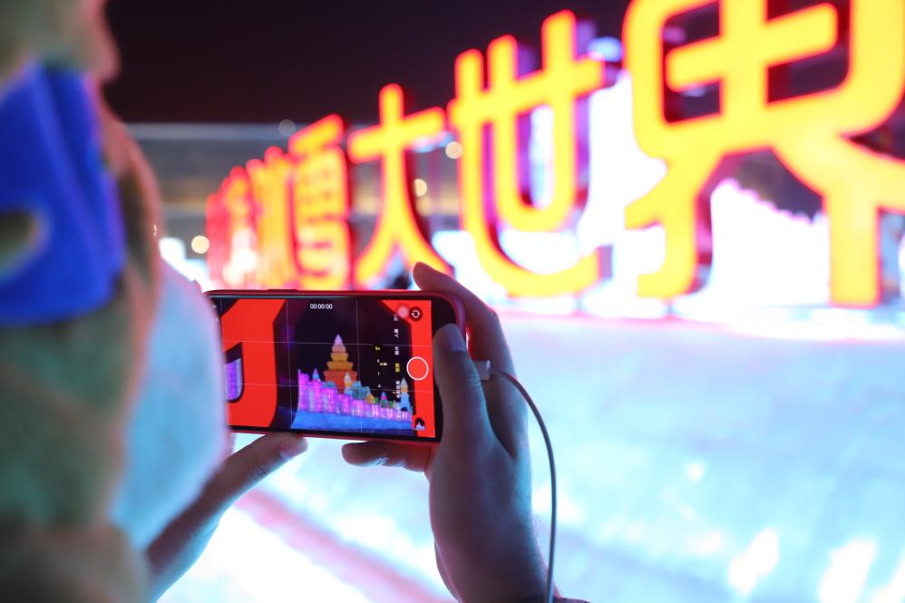 游客在拍摄哈尔滨冰雪大世界景观。新华社记者 徐凯鑫 摄