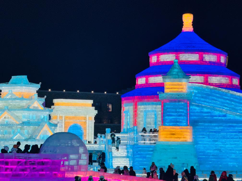 欣赏美轮美奂的冰雕艺术,拍出美美的照片,是游览哈尔滨冰雪大世界的“重头戏”。为喜迎2025年即将在哈尔滨举办的第九届亚冬会,今年,哈尔滨冰雪大世界以“冰雪同梦 亚洲同心”为主题,将亚奥理事会成员的42个国家和3个地区的地标景观,以冰雪形式进行还原。经过冰雕师们的精雕细琢,冰雪景观或恢弘大气,或细腻精致,无论是在白天还是夜晚,都呈现不同的美。