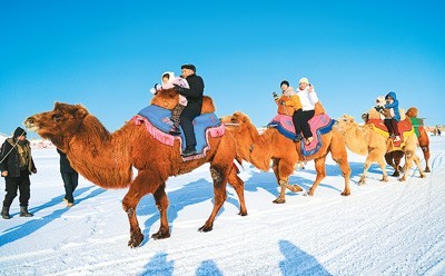 游客在新疆博湖县博斯腾湖大河口景区体验雪地骆驼。