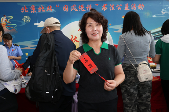 活动现场,国风元素随处可见。北京北站书法小组的成员们现场挥毫,在设计精美的国风卡片上写下“阖家团圆”“国泰民安”等真挚寄语,笔锋或灵动飘逸,或沉稳有力。墨香与节日氛围交织间,旅客纷纷驻足围观、拍照记录,这份传统与现代交融的温情场景,正是“城市会客厅”开放、包容、有温度的生动写照——来自五湖四海的人在此相聚,共享文化魅力,感受城市的温情。