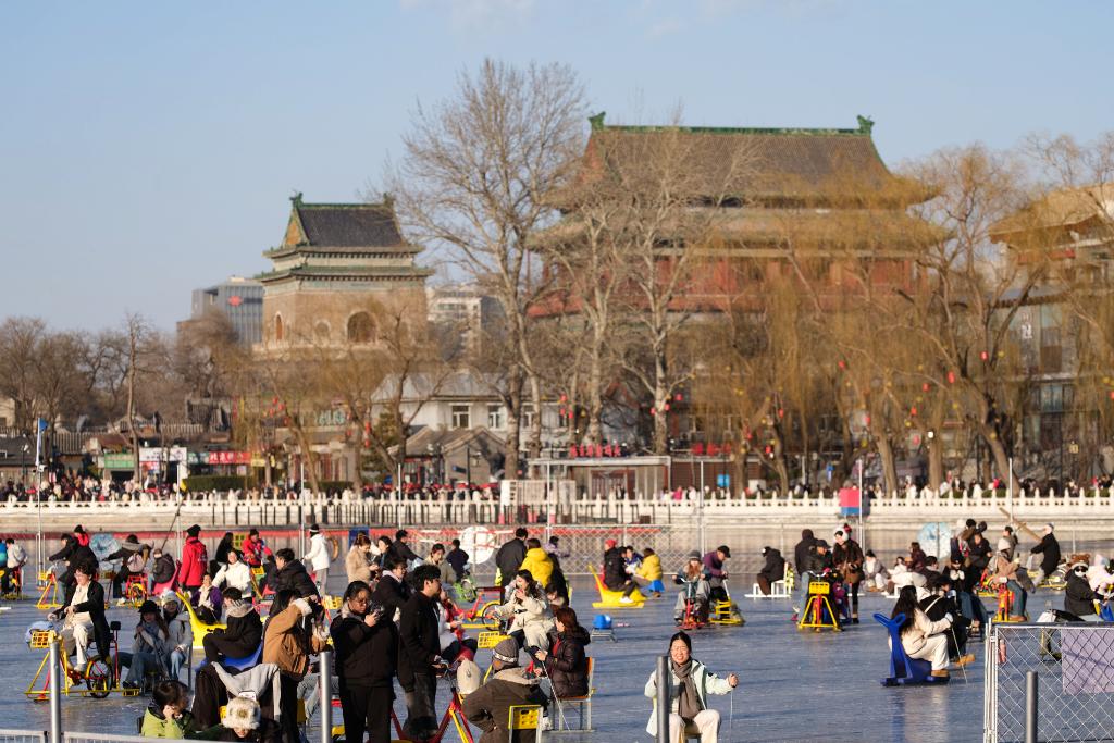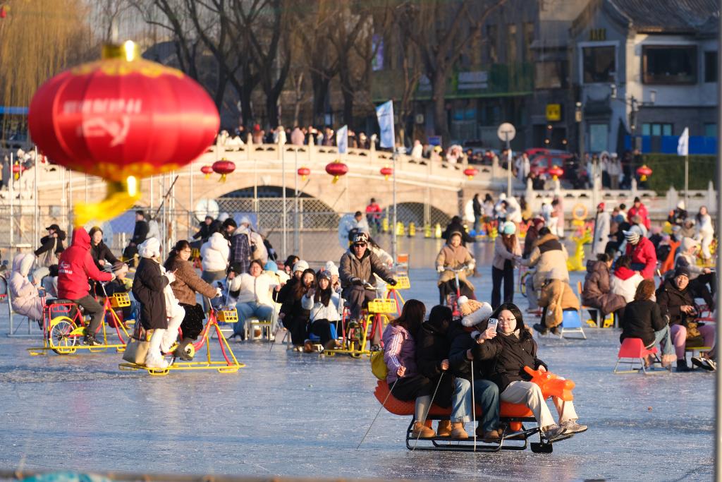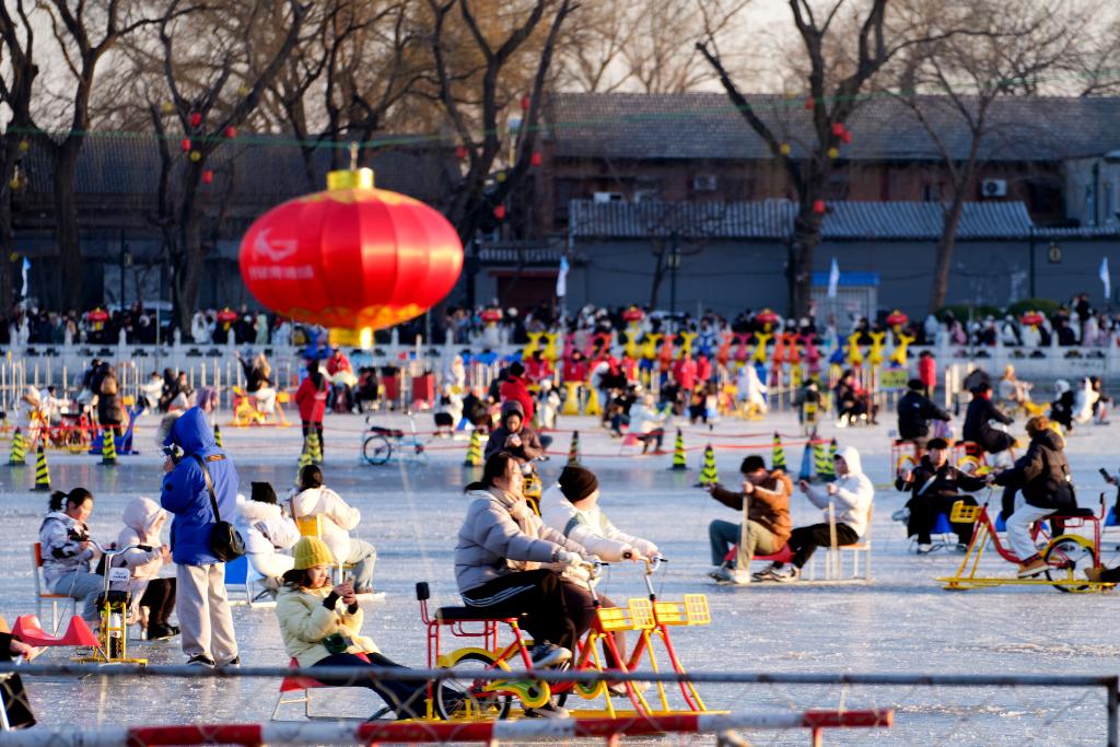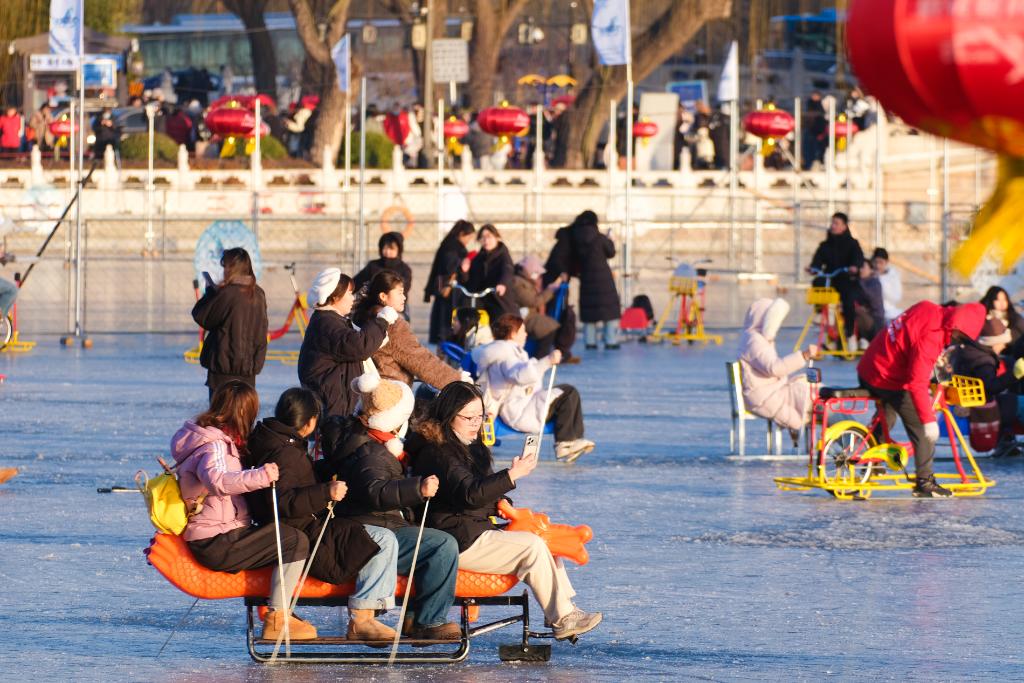 2026年1月12日,北京什刹海前海冰场热闹非凡。人们或滑雪橇、坐冰车,或骑冰上自行车,在冰面上尽情嬉戏,欢声笑语萦绕冰场,勾勒出一幅动人的冬日图景。
