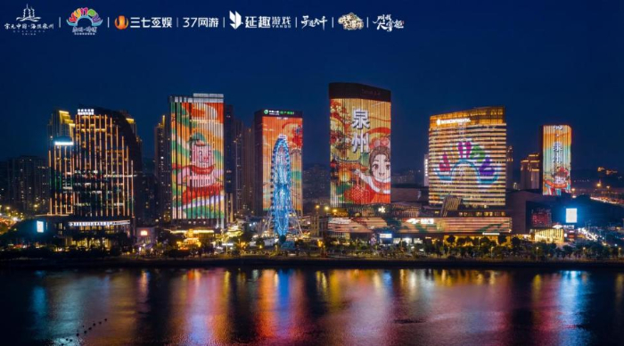 此外,三七互娱、延趣游戏联动泉州文旅打造马年新春⽂旅活动主题灯光秀,三大游戏角色联袂登上泉州大屏,为泉州市民送上新春祝福。在本次灯光秀中,巧妙融入世遗、非遗元素,结合数字投影、动态光效,兼顾文化表达与视觉冲击。数十栋楼宇的LED幕墙与点光源,同步播放联动主题画面,让泉州的新春夜色更具数字文化魅力。