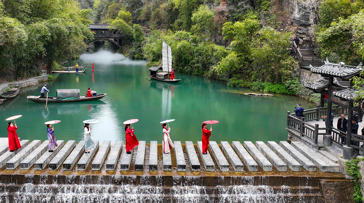 在湖北省恩施土家族苗族自治州巴东县信陵镇的土店子村,眼下正是梨花盛开季节,一树树梨花迎春绽放,绿叶丛中,洁白素雅的花朵缀满枝头,游客穿梭其中,赏梨花、观非遗展演、品美食,尽享春日浪漫。
