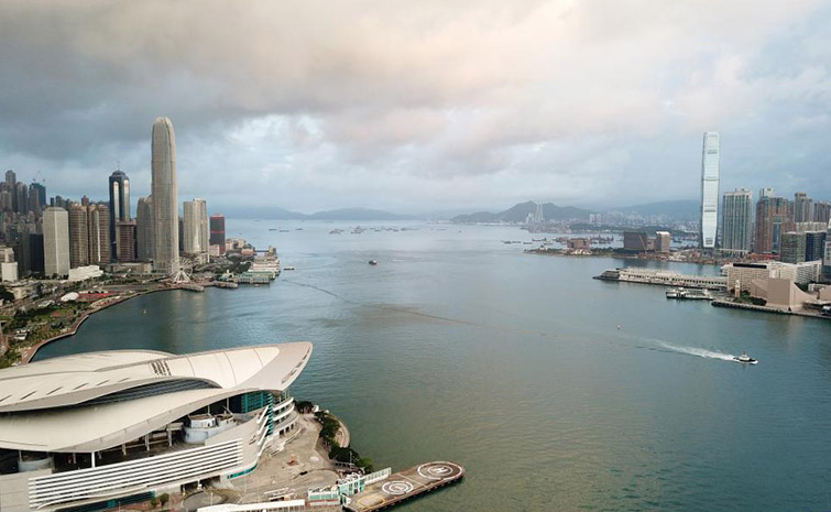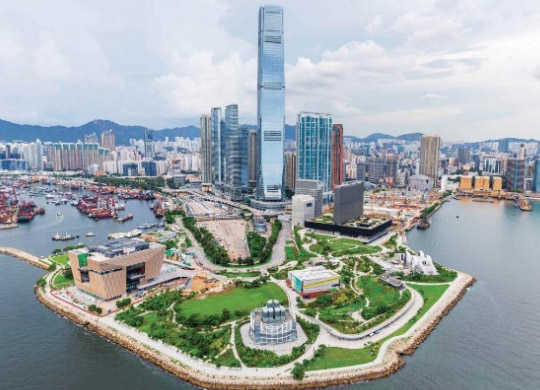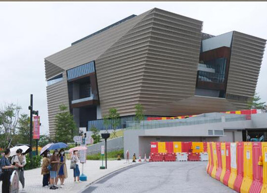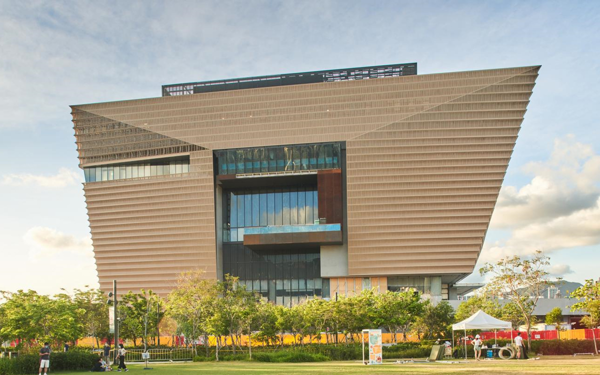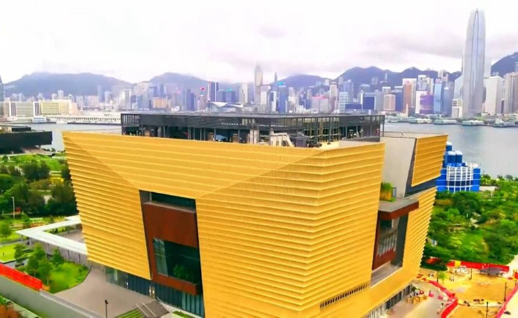 在香港维多利亚港畔的西九文化区,一座类似古代器皿方鼎的巨型建筑面朝大海昂然矗立,金色外观在阳光下分外抢眼。