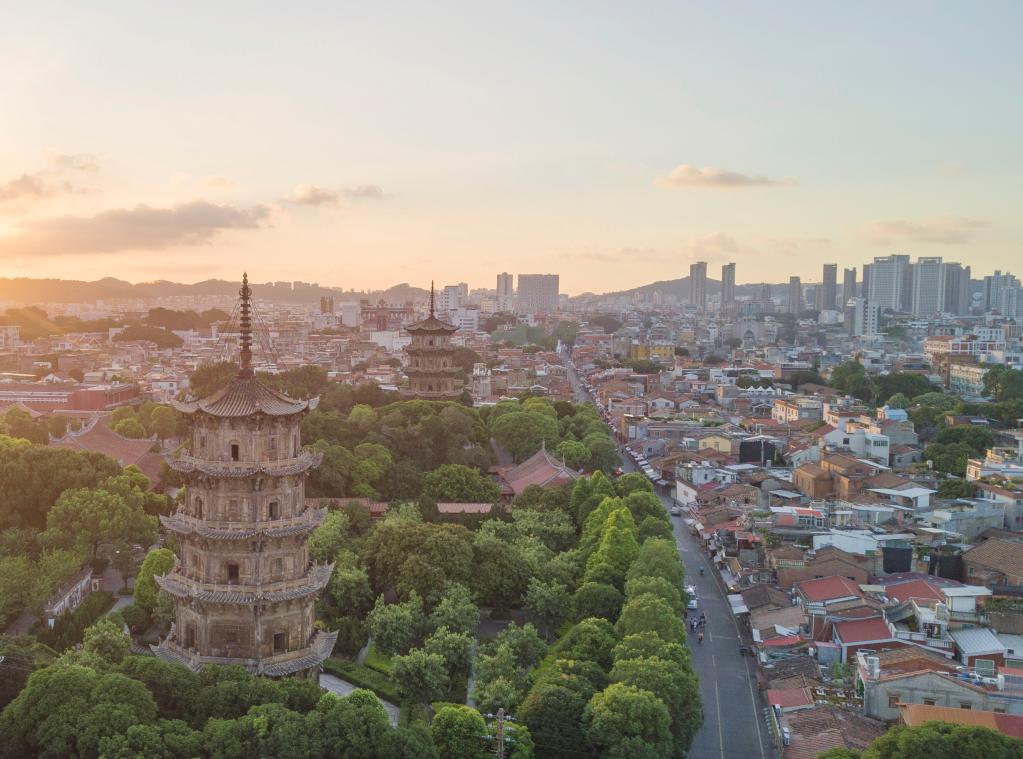 朝霞中的福建泉州开元寺东西塔及周边古城保护核心区域。新华社记者宋为伟摄