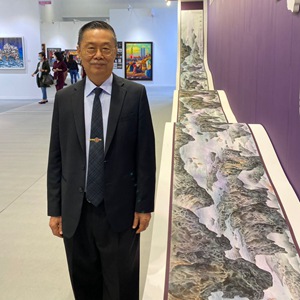 艺博会上,台北孙中山纪念馆前馆长、中华学术文教基金会董事长高崇云仔细观赏巫登益的画。他表示,两岸必须融合,以文化艺术为先,能更好地教育年轻人,增进他们对中华文化的理解。文化艺术交流能让两岸人民的心灵结合在一起,从而一同振兴中华。推动两岸文化艺术交流,是一项神圣的使命。