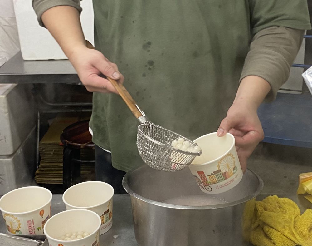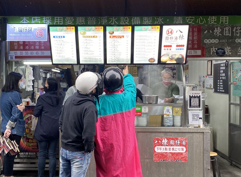 在当地食客的推荐下,记者来到了位于台北市南机场夜市的老字号“八栋圆仔汤”。老板和4个员工在十几平方米的小店内忙得热火朝天,店铺招牌花生汤汤圆、红豆汤汤圆更是供不应求。