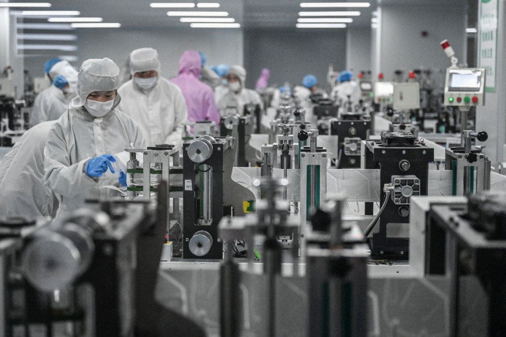 3月21日,工人在泉州晋江市一家口罩生产企业作业。福建省泉州市本轮新冠肺炎疫情造成了较大的物资需求。连日来,作为民营经济重镇的泉州市,发动各方力量,在做好各项防疫措施的前提下,加紧生产各类生活必需物资,保民生、保供应。新华社发(周义 摄)