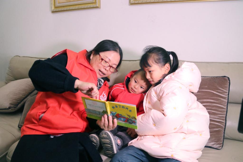 昆山“台妈好麻吉”团队成员(左一)在照顾抗疫一线工作人员家中留守的孩子。昆山市台办供图