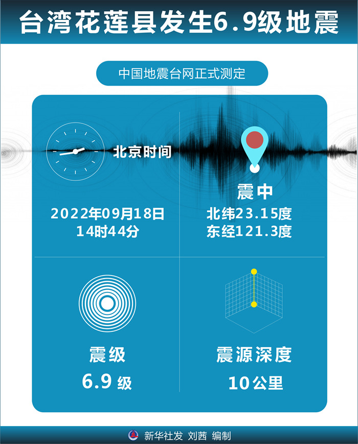 新华社北京9月18日电 中国地震台网正式测定:09月18日14时44分,在台湾花莲县(北纬23.15度,东经121.3度)发生6.9级地震,震源深度10公里。
