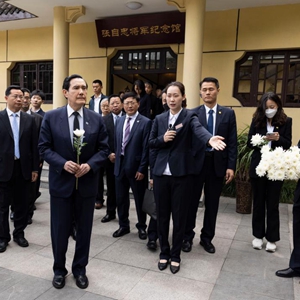 仪式前,马英九一行在张自忠将军纪念馆详细了解张自忠生平、事迹。马英九神情凝重,聚精会神倾听讲解,观看史料,不时询问。在展出的文物和历史图片前,台湾青年学生驻足思索,轻声交流感想。
