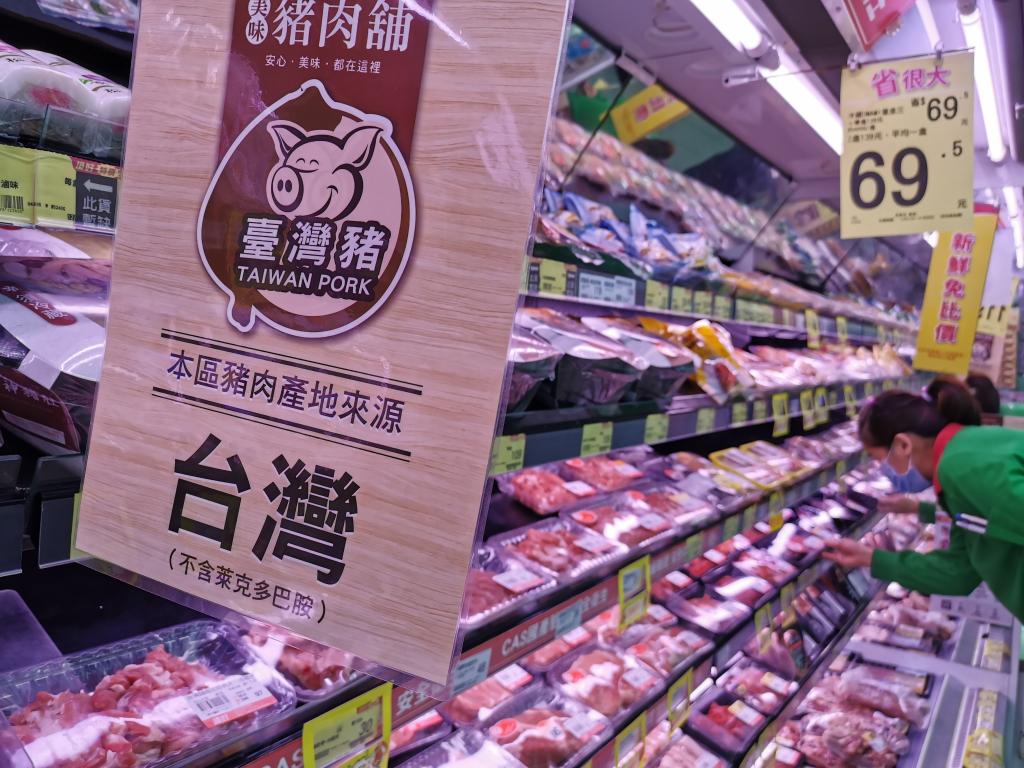 台北市光复北路一家卖场内,肉品区悬挂有“台湾猪”标识,表明不含莱克多巴胺(资料照片)。新华社发