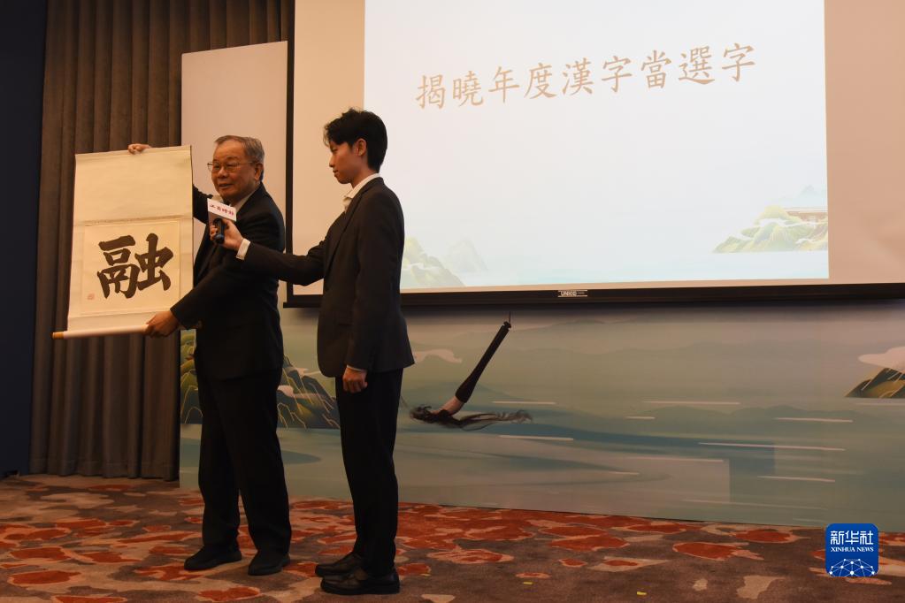 12月8日,由两岸有关机构共同主办的2023海峡两岸年度汉字评选结果在台北揭晓,“融”字以最高票当选。这是台湾中华书学会会长张炳煌(左)揭晓年度汉字。新华社记者 刘斐 摄