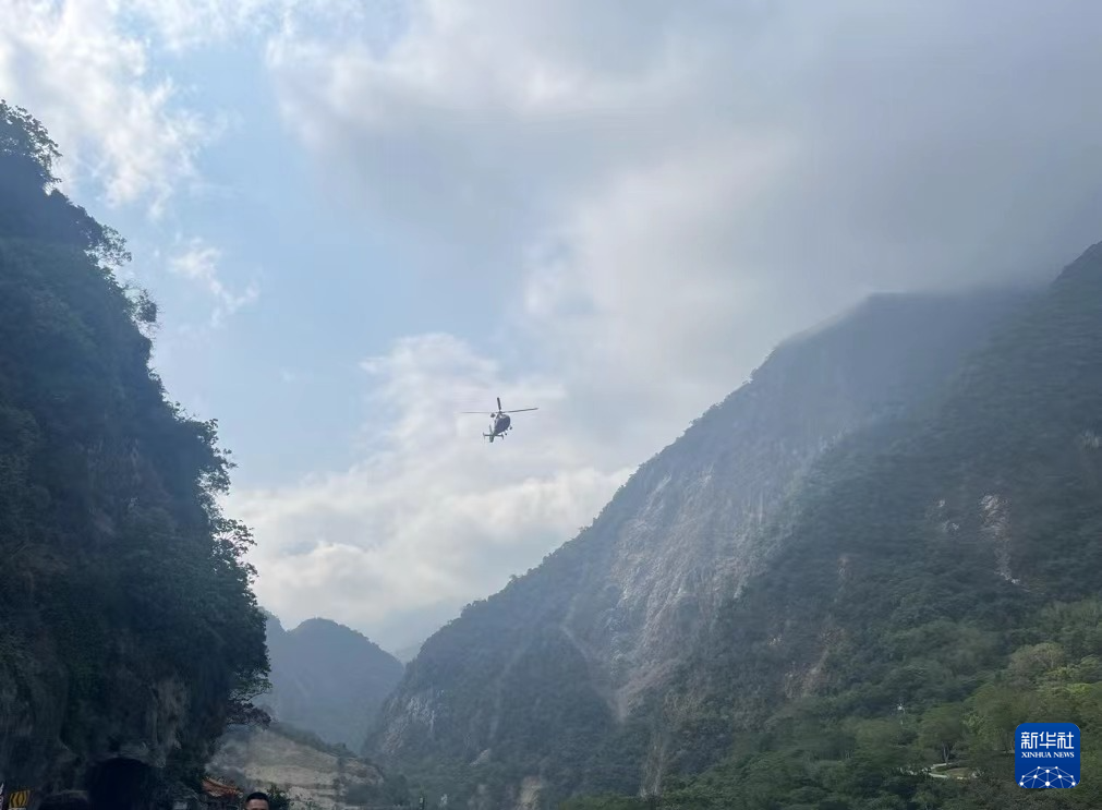 4月4日在台湾花莲的太鲁阁公园东西横贯公路入口拍摄的救援直升机前往大山深处施救画面。新华社记者 赵博 摄