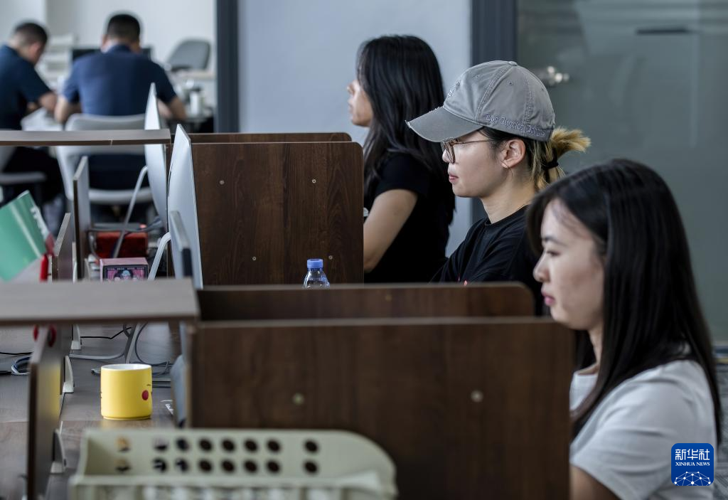 来自华侨大学的台湾学生(右二)在厦门“台青创客家”里实习(6月14日摄)。