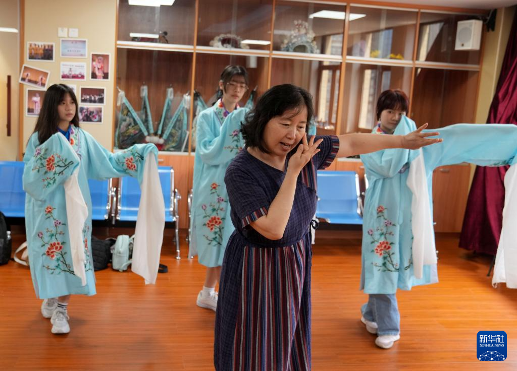 7月5日,在上海市光明中学,戏曲社团的老师曹晖指导新北市板桥高级中学的学生们体验京剧的造型和身段。新华社记者 刘颖 摄