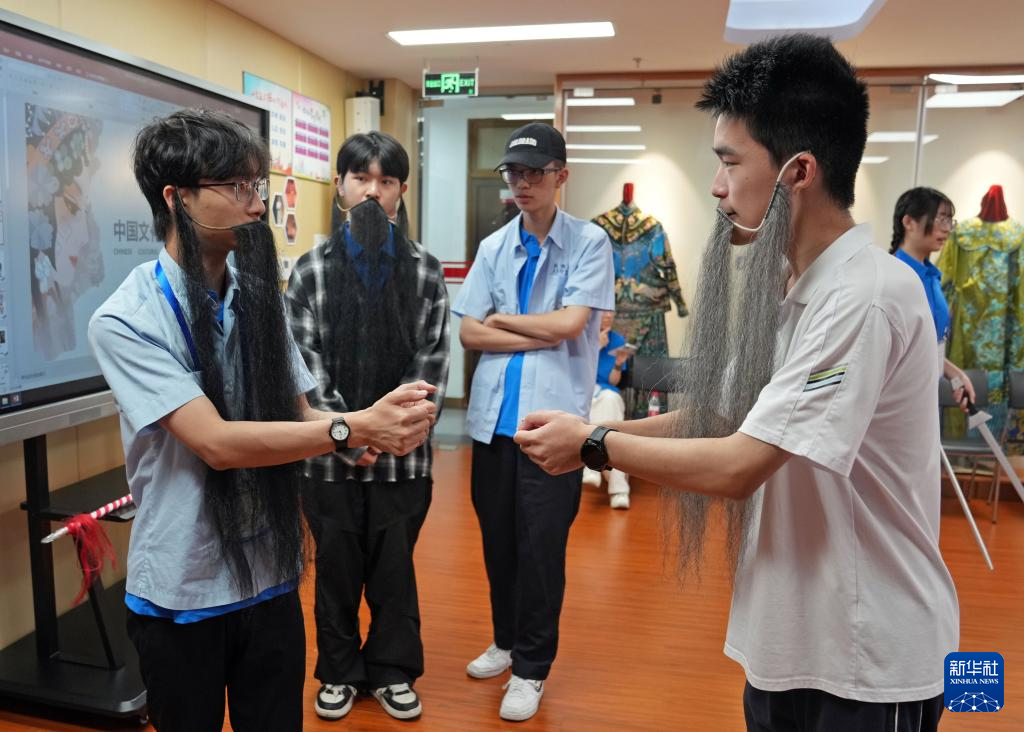 在光明中学练功房里,戏曲教师曹晖带领板桥高级中学的郑媛元等几名女生,体验京剧中花旦的身段和造型,为孩子们讲解中国古典戏曲中多姿多彩的女性形象。男生们则相互帮助,戴上了髯口,体验京剧《苏三起解》中的角色“崇公道”。同学们咿咿呀呀认真学起来,有“唱”有“念”,再配上刚学的身段动作,已是有板有眼。